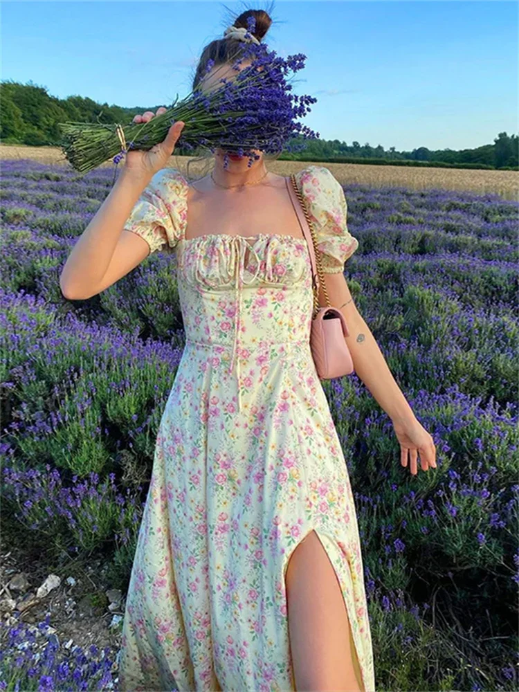 Womens Dress, Puff Short Sleeves Lace Up Chest Floral Printed Skirt